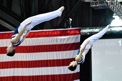 MILWAUKEE, June 27, 2017 – Synchronized trampoline kicked-off the senior elite competition at the 2017 USA Gymnastics Championships today inside Milwaukee’s Wisconsin Center. Nicole Ahsinger of Lafayette, La./Trampoline and Tumbling Express, and Clare Johnson of Huntsville, Ala./ Merino Trampoline Gymnastics Academy, took top honors for women’s synchronized trampoline. Jeffrey Gluckstein of Atlantic Highlands, N.J./Elite Trampoline Academy, and Aliaksei Shostak of Lafayette, La./Trampoline and Tumbling Express claimed the men’s senior synchronized trampoline title. Scheduled for June 27-July 2 at the BMO Harris Bradley Center and Wisconsin Center in Milwaukee, the six-day competition is the national championships for acrobatic gymnastics, rhythmic gymnastics, and trampoline and tumbling, and it features competition on both Junior Olympic and elite levels. Most of the junior and senior elite competition takes place June 29-July 1, at the BMO Harris Bradley Center. Junior Olympic sessions run all six days at the Wisconsin Center in addition to several elite sessions