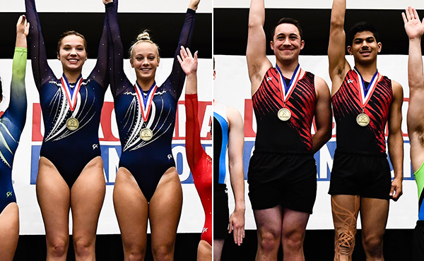 Earning their first senior synchro title, Isenberg and Verderosa claimed a 132.200 total. Brothers Jeremy and Joshua Cooper of Irvine, Calif./National Gymnastics Training Center, took second at 121.600. Paul Bretscher and Cody Gesuelli, both of Huntsville, Ala./Merino Trampoline Gymnastics Academy, were the bronze medalists at 110.750.